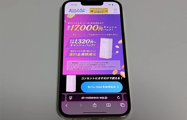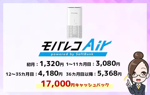 さらに、モバレコAirでは、17,000円キャッシュバックがもらえるため、ホームルーターの中で実質料金が最も安く利用することができます。