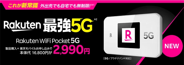 キャンペーン内容Rakuten WiFi Pocket 5Gが本体価格から13,810円割引で購入可能(一括2,990円)